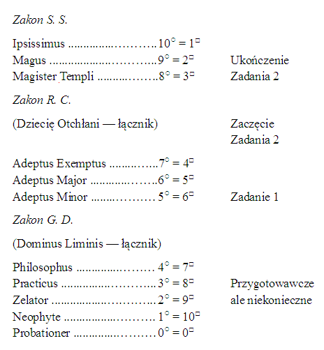 Należy stwierdzić, że te Stopnie nie są koniecznie osiągane w pełni, w ścisłym porządku, lub zmanifestowane w całości na wszystkich płaszczyznach… Podany zarys tych kilku sukcesywnych kroków jest poprawny; dwa przełomowe doświadczenia — Anioła i Otchłani — są nieuniknionymi aspektami każdej drogi. Inne zadania nie zawsze są wypełniane w podanej tutaj kolejności; pewien człowiek, przykładowo, może posiąść wiele jakości charakterystycznych dla Adeptusa Majora, a i tak może mu brakować niektórych tych, które są odpowiednie Practicusowi.